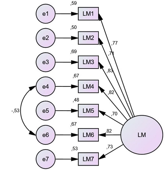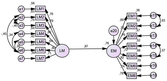 Regarding the communalities (after extraction), the analysis showed that the lowest values were LM9 and EM, for this dimension these variables were lower than the recommended by Field (2005). It calls attention to the fact of not traducing the best behaviour of the total variance, it could be an indicator to be alert in the SEM approach, particularly in measurement models.