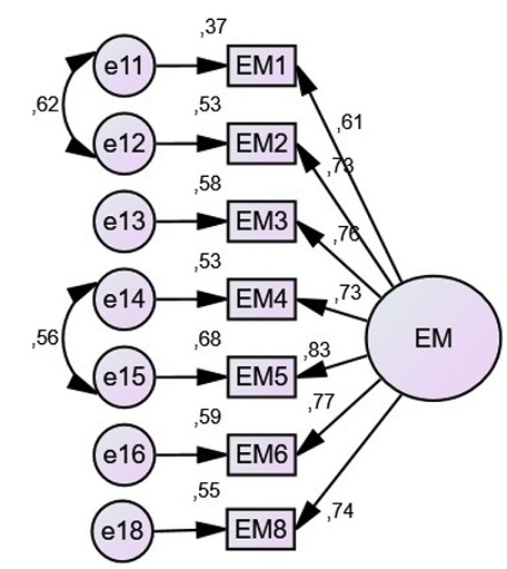 For the Environment practices measurement model was tested. The eight items from Table 1 were used to evaluate the model. The item EM7 shown lowest results and it was dropped from the model (see Figure 4).