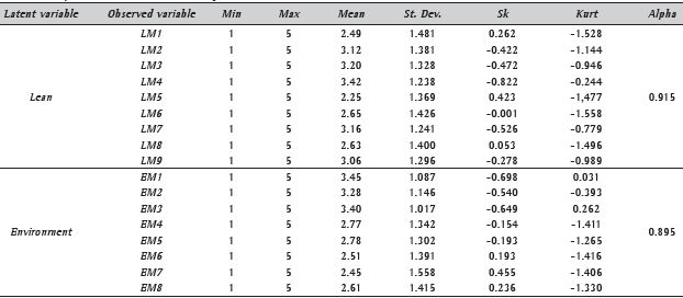 A conservative approach was followed in order to obtain variables with approximate normal distribution; skewness and kurtosis values were considered in this decision, following reference values, such as skewness value < |3| and kurtosis <|8|, according to Kline (2011).