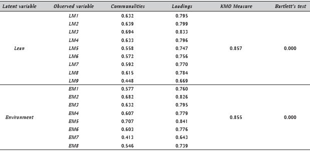 The data supported hypothesis H presented previously, corroborating to the hypothesis that lean practices have a positive effect on Environment practices (. All coefficients are significant at 0.05 level, and the model indices indicates that fit the data sample well. All items have high factor loadings and the percentage of the variance of environmental practices explained by the model is 76%.