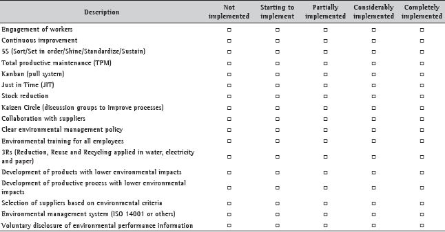 To identify relevant practices of lean and green in companies, a questionnaire based on the model (Jabbour et al., 2013) was designed (see Appendix A).