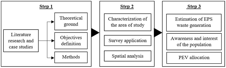 The research delineated steps are described in Figure 1. The first step consists of the definition of the objectives of the research, in the construction of theoretical ground, and the choice of the research methods, employing a literature review and search of case studies of VDP implementation to collect EPS in other cities. The application of the method happened in the second step, which covered a characterization of the area of study, the application of the survey, and the spatial analysis for VDP allocation. Finally, in the third step, the results were analyzed, which consisted of an estimation of the waste generation of EPS in Florianópolis city, the awareness, and interest of the population of Florianópolis about the recycling of EPS and the ideal points in the city to install the VDP.