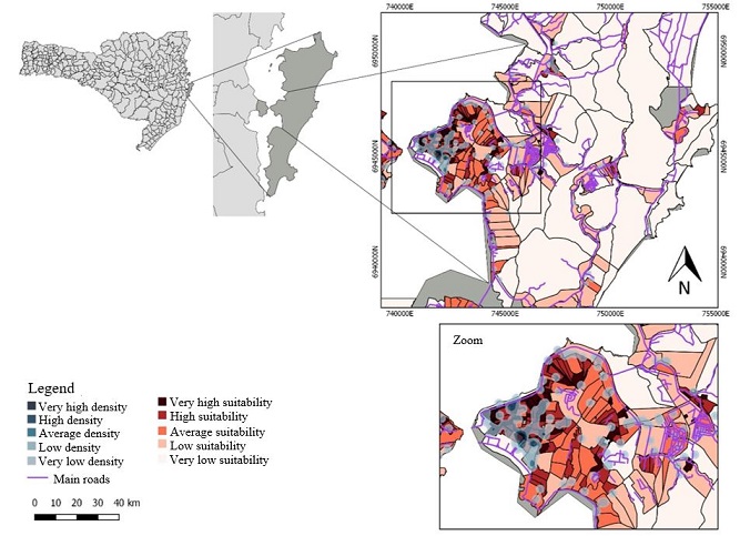 Secondly, maps of the population density of Florianópolis were created. Using the data of the number of inhabitants by census sector from the last Demographic Census of 2010 and the shapefile data of the census sectors provided by IBGE (a Portuguese abbreviation for Brazilian Institute of Geography and Statistics), it was possible to define the populational density of each census sector. Five qualitative levels were also defined to analyze these maps about their suitability for receiving a VDP based on the density of population in those sectors: very high suitability, high suitability, average suitability, low suitability, and very low suitability.