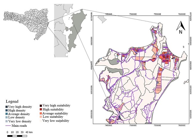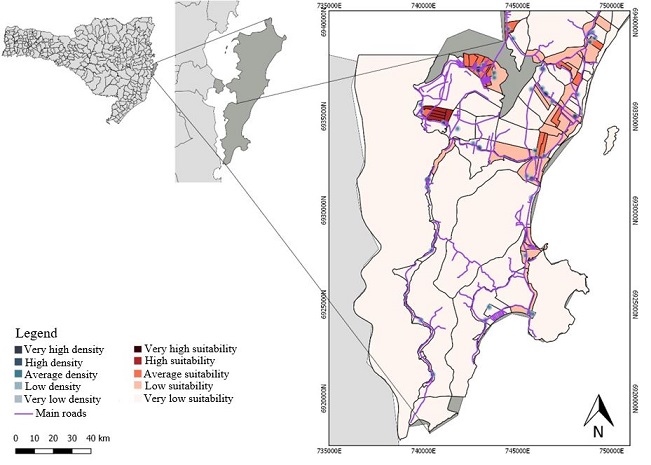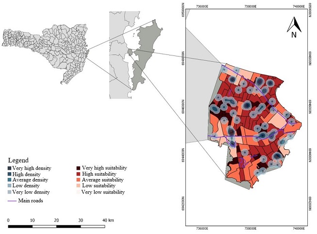 Thirdly, the main roads of Florianópolis were included in the maps. This information was added justified by the need to verify the points where would have more transition of vehicles since those who utilize a private vehicle for daily mobility would have the opportunity to leave their recycled waste in a VDP while going to work, for example. The roads defined as main routes are regarding data about intercity roads available on shapefile data of the Digital Topographic Map Collection of Santa Catarina State (Empresa de Pesquisa Agropecuária e Extensão Rural de Santa Catarina, 2004).