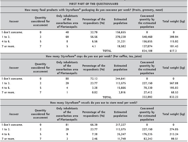 Table 1 presents the first part of the survey. In order to estimate the total weight of the waste, it was considered that one cup of EPS of 200 mL, one EPS tray of 23 cm × 33 cm × 50 cm, and one round EPS vessel for meal of 66 cm × 37 cm × 37 cm weight on average 2.5 g, 0.74 g and 1.21 g respectively. The results obtained from the survey were considered directly proportional to the total of inhabitants. Based on this statement, the value of waste generation was estimated for each one of the packaging types analyzed in the survey. The quantities are, approximately, 834 thousand of trays commercialized with food, 332.9 thousand