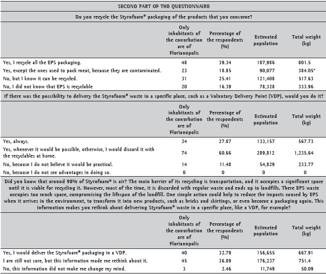 In the first part of the survey, the respondent answered questions about their consumption habits towards EPS. The second part consisted of questions about the awareness of the population about the capacity of EPS being recycled and their interest in giving this residue a proper destination since they knew at that moment that EPS is recyclable. The last question of this part was done only to those who that either would take the waste of EPS to a VDP only when it would be practical and not interfere in their daily activities, or would not take the EPS residue to a VDP because they believed it was not practical and that they did not see any advantages in doing so. This last question aimed to verify if, even with a little more information about the barriers of EPS recycling and the consequences related to not doing it, people would change their minds or not about the possibility of taking their EPS waste to a VDP.