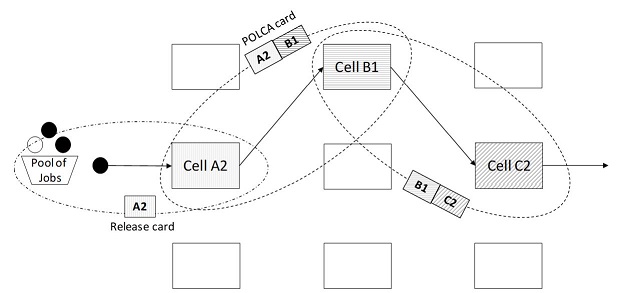 POLCA is a visual system that manages the flow of jobs though the shop floor by making use of overlapping loops of cards between successive manufacturing cells. Cards provide capacity signals between each pair of cells in the routing of the job, ensuring that upstream cells use their capacity effectively by working only on jobs that are needed downstream (Suri, 2018). In this way, POLCA synchronizes the processes between manufacturing cells, reducing the waiting time between the completion of a job in one cell and its start in the next cell (Riezebos, 2010).