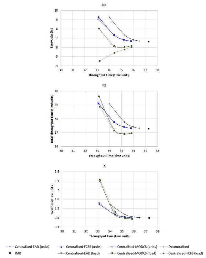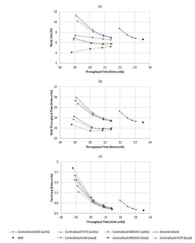 Figure 3, from (a) to (c), shows the percentage of tardy jobs, total throughput time and tardiness plotted against the shop throughput time for both centralized and decentralized job release in the general flow shop. As shown in this Figure, when moving to the left along the curves, i.e., as tighter workload limits and card counts are used, percent of tardy jobs, total throughput time and tardiness increases. This essentially results from jobs being delayed in the pre-shop pool before release. However, for some cases we see that the total throughput time starts to increase only after an initially decrease. This happens when the control procedure manages to balance workload across work cells, meaning that waiting times of jobs in the pre-shop pool are compensated by the reduced shop throughput times, as less jobs are being released to the shop floor. This may also contribute to reduce the percentage of tardy jobs. The results show that, depending on performance objectives the practitioner can fine tune the operating parameters to achieve best performance.