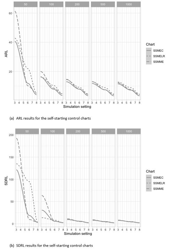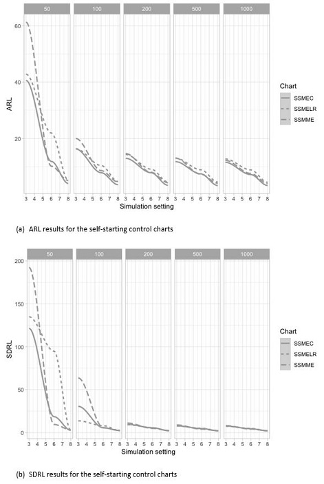 The known-parameter settings for each control chart are also included in the figures. Therefore, the ARL and SDRL results for the self-starting control charts can be tracked and compared with their asymptotes (the known parameter settings).