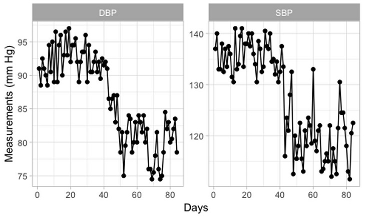 Citing the importance of monitoring BP levels over time, we applied the suggested charting methodologies to BP monitoring data previously used in Albloushi et al. (2015). Suppose in this application immediate monitoring is needed to support medical decision making to evaluate the effects of changes in medication. SBP and DBP of a 43 years old male patient who was diagnosed with hypertension were measured for 84 days. The physician suggested the patient to take 10 mg ACE (angiotensin-converting enzyme) inhibitor every day. Pre-treatment and post-treatment measurements are shown in Figure 4.