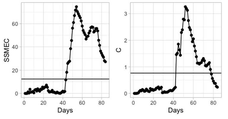 SSMEC, SSMELR and SSMME control charts were constructed using the dataset and results are presented in Figures 5-7, respectively. All the competing procedures provided strong signals after 42th observation where intervention begun. SSMEC is the only non-omnibus control chart we study. MEWMA control chart in Figure 5 presents reactions to mean shifts while C chart provides signals to covariance shifts. Here, we obtained signals from both control charts supporting a simultaneous shift in BP mean and covariance. Similarly, SSMELR chart signals after 42th reading. The type of shift is more difficult to evaluate with SSMELR control chart as it doesn’t provide built-in diagnostic tools. However, the mean and covariance components are shown in Figure 6. %M values are showing signs of increase over time meaning a strong mean shift is detected with the MELR statistic. SSMME control chart and two diagnostic tools (M and V control charts) are provided in Figure 7. SSMME control chart offers clear and more informative diagnostics while it generates signals for the post-treatment period. Evaluating M and V control charts, we can conclude a joint shift in mean vector and covariance matrix.