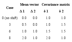 The initial base period is conducted with the in-control parameters and after this period the mean vector and/or covariance matrix shift is introduced. A sequence of normal data from a multivariate normal distribution, where and , is generated as the base samples. A set of numbers between 50 to 1000 is used to define values. For a shift in mean vector, an increment in the mean of the first component or both components is considered, thus the out-of-control mean vector is . An out-of-control covariance matrix is used for creating a covariance shift. Then, the statistics were monitored until a signal is issued by the control charts.