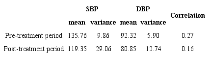 The self-starting control charts studied in this paper provided helpful information to discover problems related to health status, however, they are not directionally sensitive. Table 3 provides summary statistics for pre-treatment and post-treatment data supporting the evaluation of a joint shift. These results show a decrease in mean levels of SBP and DBP and also an increase in their corresponding variances.