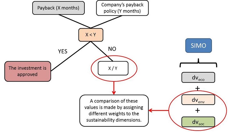 The fact of having greater obsolescence in terms of sustainability does not mean that the machine should be replaced. This diagnosis is made by comparing a Sustainability Index for Machine Obsolescence (SIMO) with the ratio between the discounted payback (for example, for the purchase of new equipment or even a retrofitting of the equipment under analysis) and the company's payback policy. Figure 4 illustrates how this comparison is made.
