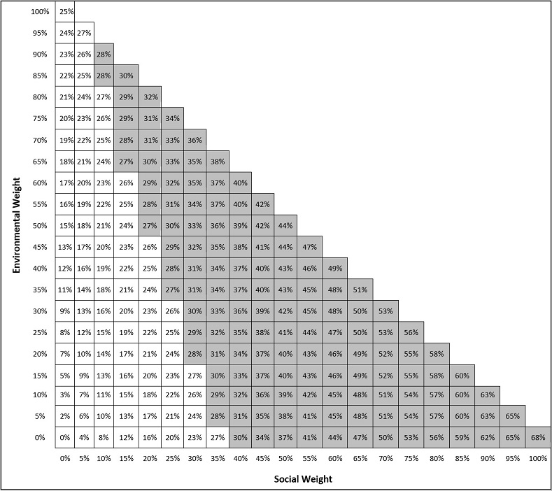 There are other combinations of weights which satisfy the comparison of Equation 10. In order to perform a sensitivity analysis of the influence of the variation of the dimensions weights, Figure 5 shows in the gray highlighted region options of combinations of weights for environmental and social dimensions that result in press A being considered obsolete. The weight of the economic dimension is not explicit, but it was used as the complementary value of the other dimensions to reach the sum of 100%. In addition, blank cells represent not possible combinations, where the sum of the weights exceeds 100%.