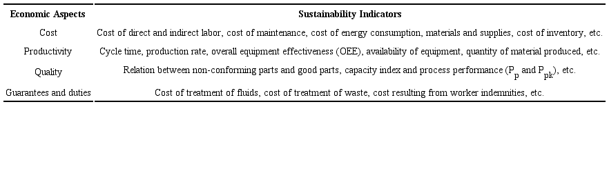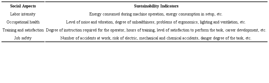 In order to create a list to guide the definition of sustainability indicators, a brief literature survey was carried out on this topic. Based on the review by Joung et al. (2013), which covers a large number of aspects and indicators, a search for some more publications in the last years related to the triple bottom line and applied to manufacturing processes was performed. In summary, the main aspects within each of the three dimensions of sustainability are presented in Table 1.