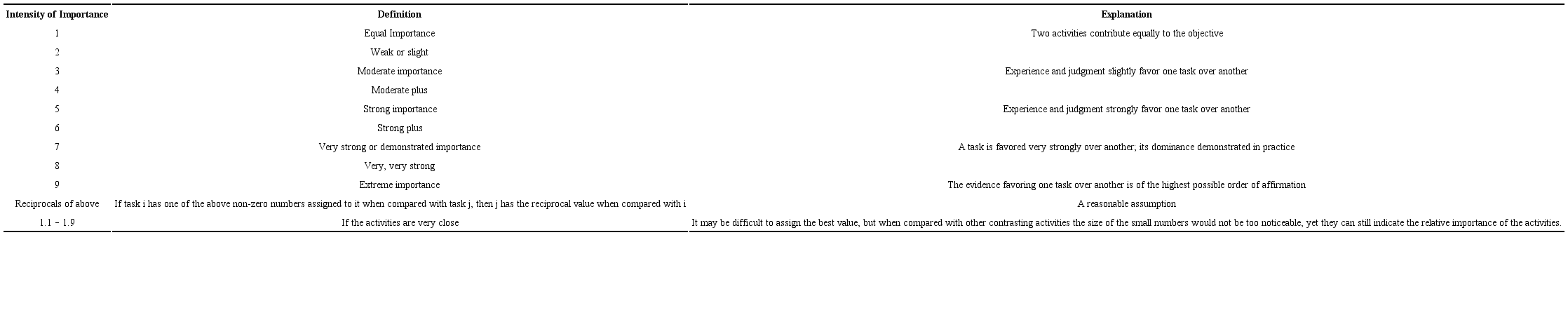 In order to perform the comparisons, it is necessary to use a scale of numbers that indicates how important or dominant one alternative is over another in relation to the criterion or property to which these alternatives are compared. This scale can be obtained through a quantitative or qualitative assessment (Saaty, 2008).