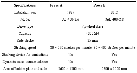 The proposed method was applied in a large company that manufactures electric machines (motors, generators and transformers) located in the state of Santa Catarina, southern Brazil. For the manufacture of electric motors’ laminations, as well as small electronics components, large-scale production equipment is used, known as high-performance lines with a high production rate (stamping speed), also called high speed stamping press lines (Hoffman & Kasparbauer, 1998). The company has a production line with more than 15 high speed presses that process together more than 300 tons of steel per day. According to step 1 of the method, two machines were chosen from the same manufacturer, whose main data are shown in Table 6.