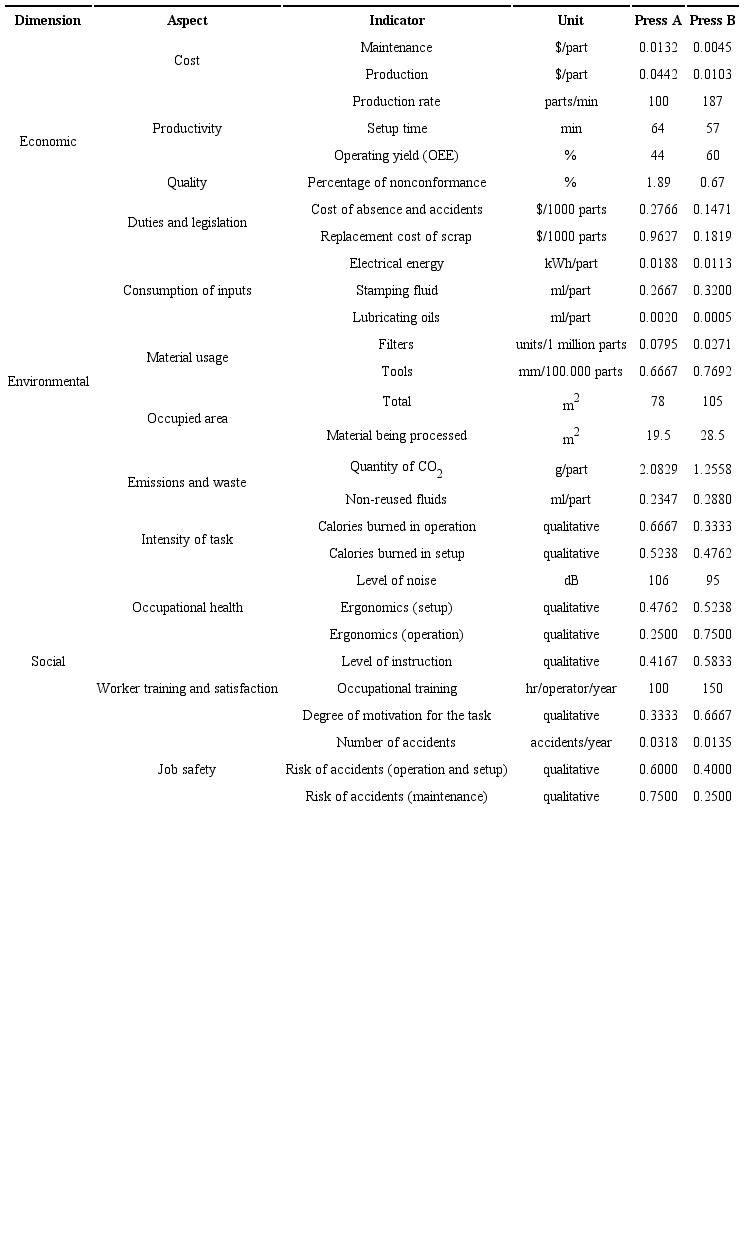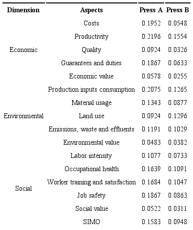 Step 7 begins with the sustainability assessment in each dimension, where it was observed that press A presented the worst result for the economic dimension (56% worse), followed by the social dimension (40%) and 21% for the environmental dimension in comparison with the reference press. In the environmental dimension, the difference was less because press A (20 years older than press B) required a smaller installed area and had less tool wear, since it ran at speeds much lower than the speeds of the newer press.