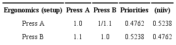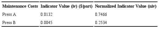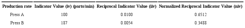 In the case of a qualitative indicator whose lower value corresponds to a greater obsolescence of the press, the example of the indicator “ergonomics in setup” is presented. In this case, it was observed that Press A is somewhat less ergonomic than Press B. Table 11 shows the values assigned to the presses as well as priority vectors applied. Equations 5 and 6 are applied to determine the normalized values.
