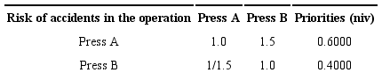In the case of a qualitative indicator in which its larger value corresponds to a greater obsolescence of the press, the example of the indicator “risk of accidents in the operation” is shown. In this case, Press A has a greater risk of causing accidents in the operation than Press B. Thus, the priority vectors of the AHP method are determined, which are considered the normalized values (Equation 4), and they are shown in the last column of Table 10.