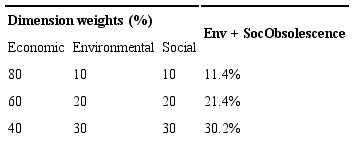 Applying Equation 1, the discounted payback time is equal to 76 months, which is 27% higher than the payback policy adopted by the company for this type of investment. However, as a sequence of step 7 different weight combinations were assigned to the dimensions using Equation 10 in the percentage form and considering press B as reference. As shown in Table 15, it can be observed that a weight of 40% for the economic dimension, 30% for the environmental dimension and 30% for the social dimension results in the press being diagnosed as obsolete from the sustainability standpoint, since the value was above 27%.