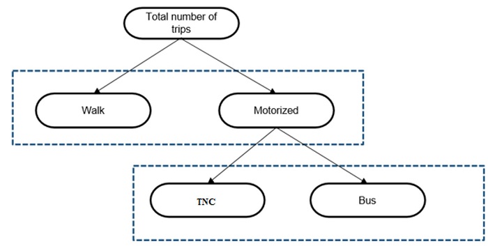 In this paper, we used the Nested Logit Model, which is an extension of the multinomial logit model designed to capture correlations between alternatives (Bierlaire, 1998). It differs from the multinomial logit model because it is possible to group alternatives that are similar in the same hierarchy. The grouping of transport alternatives was carried out in two hierarchical levels: (i) level one corresponding to the alternatives of walking and motorized transport; and (ii) level two corresponding to transport by TNC and bus. Figure 2 shows the structure of the Nested Logit Model in two levels, adopted in this paper.