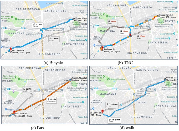 In this paper, the following alternative scenarios were considered: walking, bus and car transport service provided by Transportation Network Company (TNC), such as Uber or Cabify. It is important to reinforce that recently the use of other modes of individual transport is increasing in cities worldwide, such as the dockless scooter-share services, which were not considered in this research because they only started operating in Rio de Janeiro in 2019. Moreover, while the BSS are being offered for a longer period of time and are primarily used by individuals commuting to and from work, the scooter-share service is not, and it has not been offered for a period of time long enough to build trust within the community, and for many residents these scooters remain a novelty (McKenzie, 2019). The Subway mode was not considered, once this paper has focuses on last mile travel behavior along short travels scenarios up to 5 km, similarly to that adopted by Liu et al. (2019).