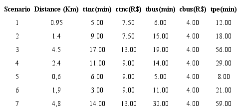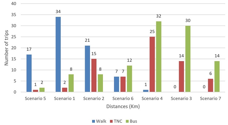 Trips performed by TNC exceeds the number of trips performed by bus only in scenario 2, since the distances considered in these scenarios, result in the minimum fees charged for private transport applications, making it thus a viable option in comparison to bus. To the extent, however, that travel time per car increases, reflecting on higher service charges, bus transportation becomes more advantageous. This explains the negative sign of parameter B in the TNC utility function variable ctnc (Table 3). For scenarios 3, 4, 6 and 7, the bus option prevails in relation to other modes of transport. When comparing the interviews results (Figure 4) with the result of the utility functions application (Figure 5), it was verified that the model was able to determine the BSS users predominant choice between motorized and non-motorized transport for all seven scenarios, proving to be equivalent to all observed results in interviews.