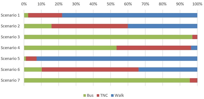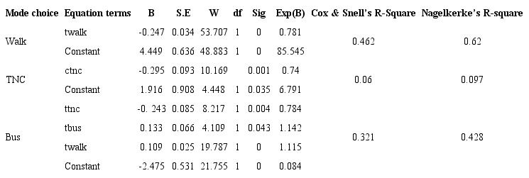 Therefore, by applying Equation 2, the probabilities of choosing walking, TNC and bus travel are defined according to Equations 7 to 9.