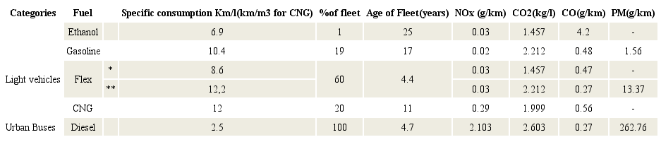 For estimating reductions in GHG and air pollutants emissions due to the modal shift, trip projections were made for the time interval of one year, adopting, in a simplified way, the average value of the trips made in the two months whose data were made available by Tembici. We followed the bottom-up methodology, using the emission factors proposed in the 2nd National Inventory of Atmospheric Emissions by Road Automotive Vehicles (Brasil, 2013). Data on the category and average age of the car fleet was obtained in the data provided by the authors of the Technical Report - GHG Emission Scenarios - 2050 (D’Agosto et al., 2018), and the average age of the bus fleet was obtained from the Summary Report of the transportation system by bus in the city of Rio de Janeiro (Federação das Empresas de Transportes de Passageiros do Estado do Rio de Janeiro, 2018). The percentage of the current fleet according to each type of fuel was obtained from the State of Rio de Janeiro - 2017-2031 Energy Matrix Report (Rio de Janeiro, 2018). Table 2 presents the summary of the factors considered for the calculation of emissions. Since it is not possible to estimate the exact proportion of consumption between gasoline or ethanol options for flex vehicle, the row corresponding to flex vehicle presents the range of values for the hypothesis of gasoline or ethanol use by flex-fuel vehicles, according to MMA (Brasil, 2013).