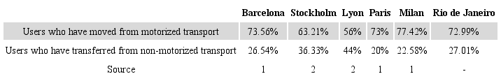 The first researches on the topic show general agreement with the assumption that the launch of BSSs demonstrated an increase in global cycling activities in urban areas. For instance, the percentage of trips made by bicycles after the launch of the BSSs increased from 0.75% in 2005 to 1.76% in 2007 in Barcelona, from 1.0% in 2001 to 2.5% in 2007 in Paris and from 0.5% in 1995 to 2% in 2006 in Lyon (García-Palomares et al., 2012). In addition, a BSS (OYBike) study in London revealed that 40% of the bike sharing system users previously traveled by cars (Noland & Ishaque, 2006). On the other hand, Pucher et al. (2010) argued that such results were inconclusive because, despite the fact that cycling has been increasing in cities since the introduction of BSSs, the growth of bicycle sharing mode may have been the result of the overall improvement of bicycle facilities. Even so, DeMaio (2009) showed explicitly that the BSS in Montreal was successful, reducing GHG emissions by more than 1,300 tons since its implementation in May 2009, although this figure represents only 0.009% of total greenhouse gases emission from Montreal (13.7 million tons of CO2 equivalent) (Pembinas Institute, 2019). A recent study by Hamilton & Wichman (2018) revealed that BSSs reduced neighborhood jam in Washington, D.C.