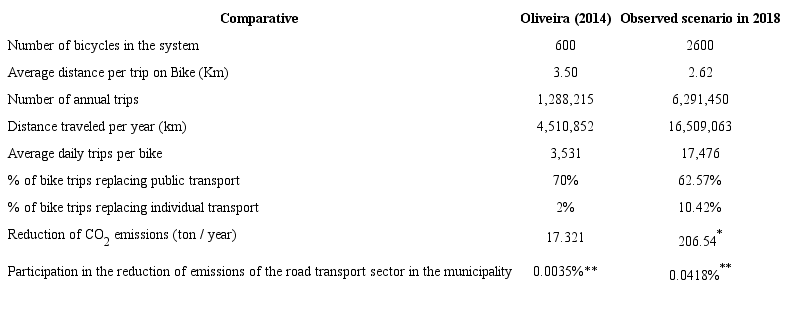 Detailed interviews were conducted by Oliveira (2014) with BSS users in Rio de Janeiro and their results were checked for plausibility, comparing it with rates for transport modes replaced by BSSs collected in papers published for other cities (Intelligent Energy Europe, 2011; Zhu et al., 2012; Fishman et al., 2015). When comparing the CO2 reduction results estimated in this paper with the analysis by Oliveira (2014), it is possible to verify that the BSS in the city of Rio de Janeiro has evolved in terms of the environmental benefits provided, since there was an increase in the gross reduction of CO2 (ton CO2/year). It is justified by the greater number of bicycles available, reflecting in the number of trips and kilometers traveled per year, as shown in Table 6. Average distances traveled per trip changed from 3.5 km in 2014 to 2.62 km in 2018, presenting an average reduction of 25.14%, which can be explained by the growing number of stations made available by the system. This figure went from 60 stations in 2014 to 193 in 2018.