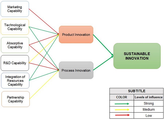 Partnership capability has a medium influence on process innovations, and; absorptive and marketing capabilities have a low influence on both innovations. This is because in the company, the measurement of gains by these DC is subjective. Regarding organizational capability, it does not influence any of the sustainable innovation identified in empirical research. Thus, it is not represented in the tested framework (Figure 2).
