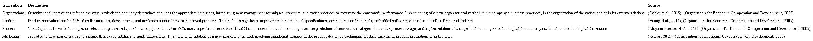 Modern and traditional paradigms of innovation stem from the work by Schumpeter (2002). The author defines innovation as new combinations of new or existing knowledge, resources, equipment, and other factors. It is related to new changes in product development, production processes, markets, resources, materials, and organizational forms (Chen et al., 2018). According to Rahman et al. (2015), innovations may emerge in response to a specific problem (incremental innovations) or a creative idea unexpectedly developed (radical innovations). Thus, innovation refers to converting an invention into a new or improved, useful, and marketable product or process (Rahman et al., 2015). The Organisation for Economic Co-operation and Development (2005) classifies innovation into four types (Table 1).
