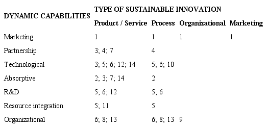 By analyzing the literature on DCs focusing on sustainable innovation, a large part of studies focused on product and process innovations and therefore used a wide range of capabilities (Table 2). Table 2 also shows studies (on a smaller scale compared to product/service and process innovations) focusing on marketing and organizational innovations.