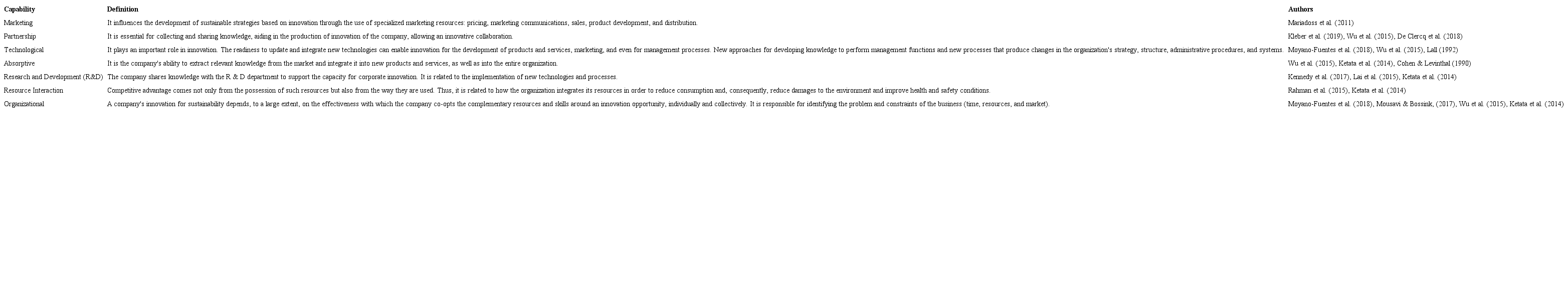 Thus, the authors presented in Table 2 demonstrated some evidence of how DCs are essential for developing sustainable innovations. For example, Mariadoss et al. (2011) considered that to influence consumers to adopt environmentally friendly products; firms need specialized marketing capabilities that can effectively relate this information. The authors also consider that marketing capability plays a critical role in the process, organizational, and marketing sustainable innovations strategies. Another example comes from De Clercq et al. (2018) that affirm for the development of sustainable products, firms need capabilities for the development of network relationships. Ketata et al. (2014), in their research, present the relevance of absorptive capability for sustainable innovations, such as product and process, especially those investments that are focused on investing in employees. Table 2 allowed developing a synthesis of DCs related to sustainable innovations considering the triple bottom line approach, and Table 3 shows a definition of each DC presented in Table 2.