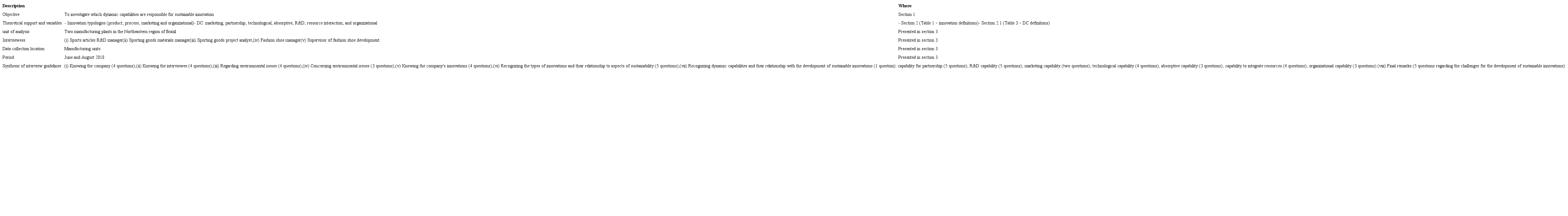 As recommended by Yin (2003), the main instrument for data collection was an interview script (see Appendix A), with some questions that guided the interviews (a synthesis of the questions adopted in the script is also presented in Table 4 – research protocol). The questions were developed as well as conducted based on the theoretical framework represented in Figure 1. In the interview script, besides adopting questions regarding sustainable innovations and dynamic capabilities, we also included questions regarding the levels of influence of the dynamic capabilities in the development of sustainable innovation types, adopting a scale of 1 to 5 (where the higher the number, the greater the influence of capability of innovation).