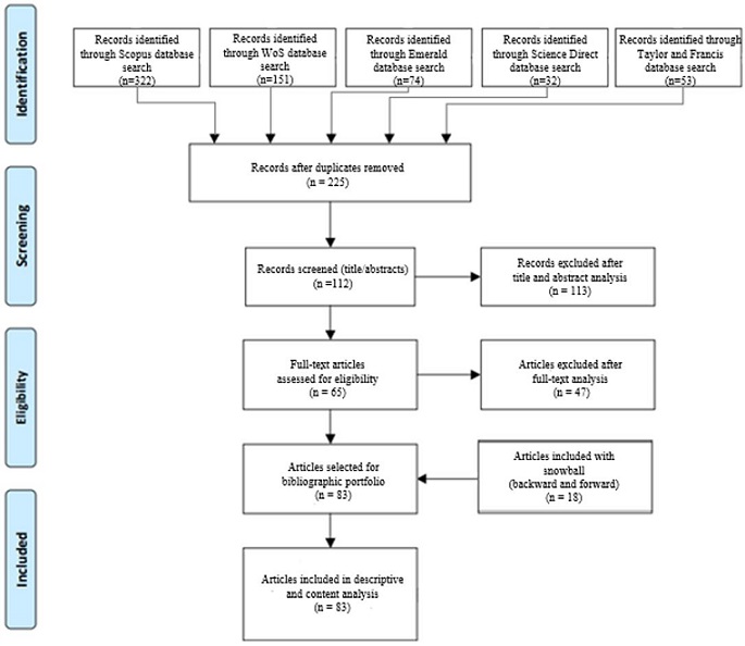 Furthermore, the final stage of the article inclusion/exclusion process was the backward and forward search. The backward consists of evaluating the literature cited by the articles found in the research from the keywords and the forward consists of reviewing the articles that cited those that were filtered by the keywords (Thomé et al., 2016). Figure 1 describes the process of including and excluding articles during the evaluation and selection of studies, following the PRISMA protocol (Preferred Reporting Items for Systematic Reviews and Meta-Analyzes) (Moher et al., 2009).