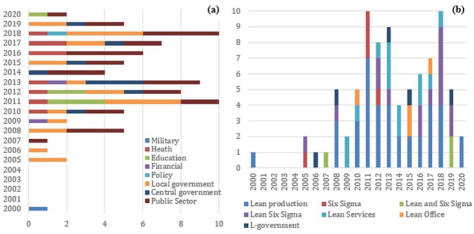 Figure 2 illustrates the distribution of the selected articles, which referred to Lean-based methodologies in public sectors, by year of publication (a)concerning public categories, and (b) concerning to CI methodologies. In general, the results indicate that lean-public topic has gained special interest and popularity within the research community since 2005. After 2010, the topic gained more relevance and more papers were published. The distribution of papers by publication year across the last decade depicts an increasing interest of researchers in the topic. More than half of the papers (79.5%) were published recently, from 2011 to 2020.