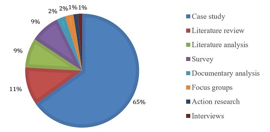 Figure 3 depicts the frequency of articles per method. Sixty-five percent of the articles adopt a case study methodology. Case studies from public services such as Higher education, Healthcare and municipal services were the most frequent among all studies. There was also the presence of multiple case studies involving financial and public consultancy services.