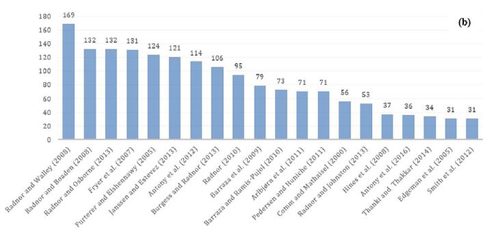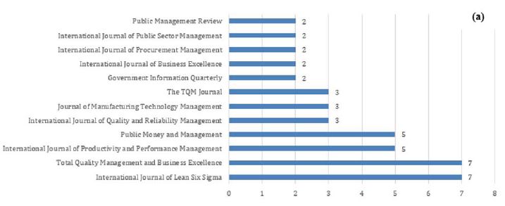 Figure 4a presents the most frequent journals in the sample of selected documents and the number of papers published in each one. The “International Journal of Lean Six Sigma” and the “Total Quality Management and Business Excellence” were the journals with the most publications and were followed by the “International Journal of Productivity and Performance Management” and the “Public Money and Management” both with five publications. “Public Money and Management”, “Journal of Manufacturing Technology Management” and “The TQM Journal” had three publications each. Figure 4b depicts the number of citations of the article who received more than thirty citations, verified in May 2020, which is used to measure the impact of the papers in other peer-reviewed articles that were indexed in the Scopus and WoS databases. Radnor & Walley (2008) are the most cited, followed by Radnor & Boaden (2008), Radnor & Osborne (2013), Fryer et al. (2007), Furterer & Elshennawy (2005) and Janssen & Estevez (2013). In more recent papers, after 2015, Antony et al. (2016), Tortorella et al. (2017) and Antony et al. (2019) appear as the most cited articles.
