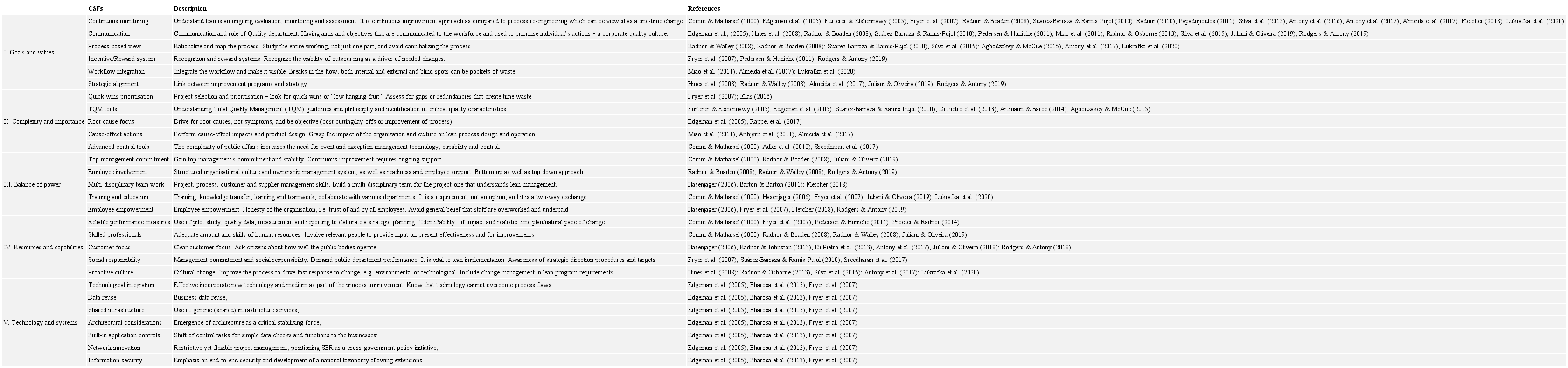 Therefore, as seen in the synthesis of the studied cases, a wide range of individual, organizational, and environmental factors affect the fate of lean in an organization. To develop lean public management, one should pay attention to the CSFs pointed in Table 2. They are divided into a taxonomy of five dimensions that have all proved to influence the lean implementation in the public sector: I. Goals and values; II. Complexity and importance; III. Balance of power, IV. Resources and capabilities, and V. Technology and systems.