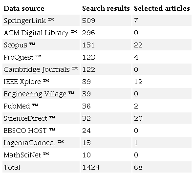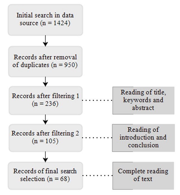 The search resulted in 1424 articles, from which 474 duplicate papers were excluded, reducing the sample to approximately 67% of the initial amount. After the first filtering, 236 records remained; with the second filtering, the number dropped to 105; and after the final selection there were 68 remaining articles. These selected articles are related to their original search sources in Table 1. In cases where there was duplicity of articles in different sources, only one of them was considered.