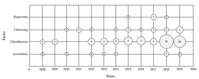 Related to second question, to characterize DM in OSH, the use of tasks, techniques and tools of the selected records were analyzed. To list the tasks used in DM, four types of tasks were considered; three associated with supervised learning - association, classification and regression - and one - clustering - linked to unsupervised learning.