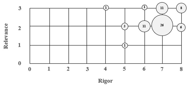 This figure shows the incidence of studies on its upper right corner. It indicates they are characterized by high rigor and relevance/credibility. The higher results are represented by twenty-six studies that got marks 7 and 2 respectively in rigor and relevance and eleven studies that got 7-3. Low results are represented by one study with marks 4-3; one with 5-1 and three with 5-2. Finally, eight studies got the highest marks in both aspects (8-3).