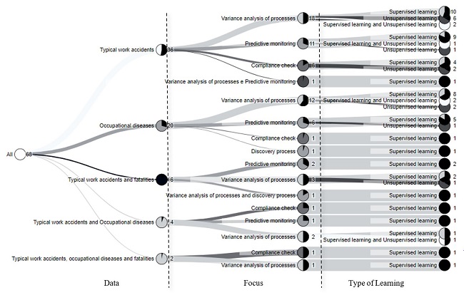 Regarding the Focus of the 36 studies classified as Typical Occupational Accident, 18 (50.00%) were shown as Process Analysis of Variance, 11 (30.55%) as Predictive Monitoring, 6 (16,67%) as Compliance Check and 1 (2.78%) as Variance Analysis of Processes and Predictive Monitoring.