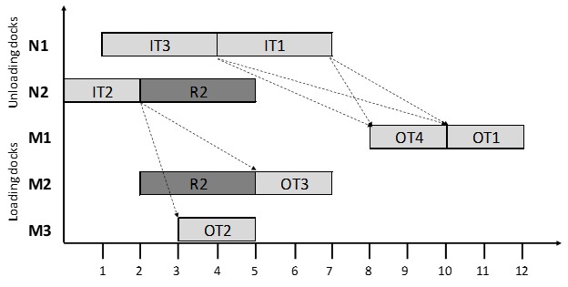 To give the reader a better perspective of our problem, we present an illustrative example. For this example, we assume the following sets: and . Figure 1 shows a solution to the example. In this case, only the requirement was accepted, and it was scheduled at the inbound dock and outbound dock . Inbound trucks and were unloaded at unloading dock . Inbound truck was unloaded at unloading dock . Outbound trucks and were loaded at dock . Both trucks needed products from inbound trucks and , for that reason their loading operation starts after the unloading operation finishes of trucks and . Outbound trucks and were loaded at docks and respectively. Both trucks needed products from the inbound trucks, for that reason their loading operation starts after the unloading operation finishes of the trucks.
