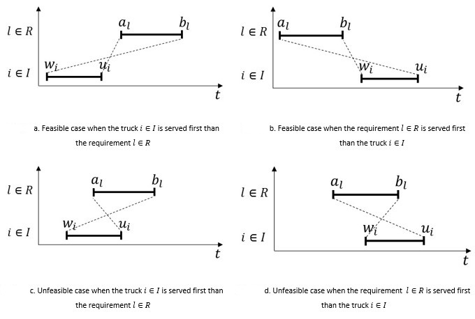 Constraints (30-33) guarantee that the inbound truck and a requirement will not overlap if they are assigned to the same dock . In these constraints, the start of the requirement is always compared against the end of the service of the truck , and the end of the requirement against the start of the service of the truck , as presented in Figure 2. It is important to notice that the constraints will be trivially met if (i.e., the requirement is not assigned to the dock ) or (i.e., the truck is not assigned to the dock ). However, in the case that and , for obtaining a feasible solution the inbound truck and a requirement must be scheduled as the shown cases Figures 22b. For meeting the case in Figure 2a (i.e., , and at the same time ) must take the value of 1. For meeting the case in Figure 2b (i.e., , and at the same time ) must take the value of 0. Therefore, the feasible case presented in Figure 2a will occur for , and the feasible case presented in Figure 2b will occur for . It is important to notice that with these constraints, the unfeasible cases presented in Figures 2c and 2d will not take place.