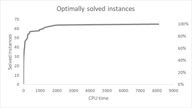 Figure 3 presents the behavior of the number of optimal solutions found within the time. As seen in Figure 3, we observe that 91% of the optimal solutions have been found within 958 seconds, which also allows us to conclude that the MILP formulation behaves in an acceptable way.